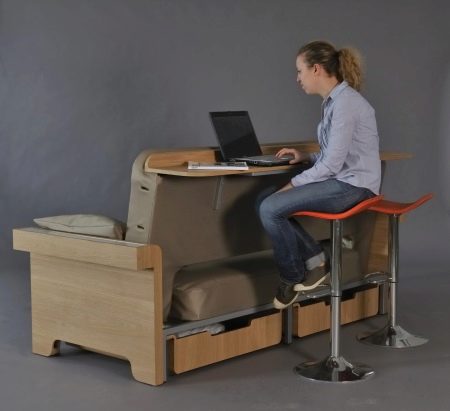 Modele transformatorowe 4 w 1 są niczym więcej niż wielofunkcyjnymi produktami, które łączą kilka elementów: sofę, łóżko, szafę i biurko. Zasadniczo jest to wbudowany rodzaj mebli, których wygląd po zmontowaniu jest inny. Na przykład niektóre produkty są jak sofy zainstalowane blisko ściany, inne wyglądają jak fotel ze stołem wbudowany w zestaw mebli.