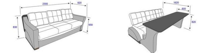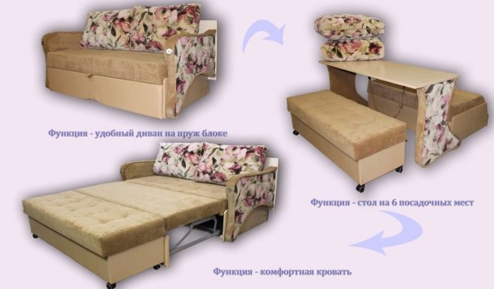 Główną częścią modyfikacji jest złożona konstrukcja ze stołem i jego podporami, które po zmontowaniu służą jako podłokietniki i oparcie sofy. Konfiguracja modeli może być inna: podłokietniki są sztywne, miękkie, proste, kręcone, monolityczne, rozwidlone. W zależności od modyfikacji oparcie można uzupełnić miękkimi poduszkami o różnych kształtach.