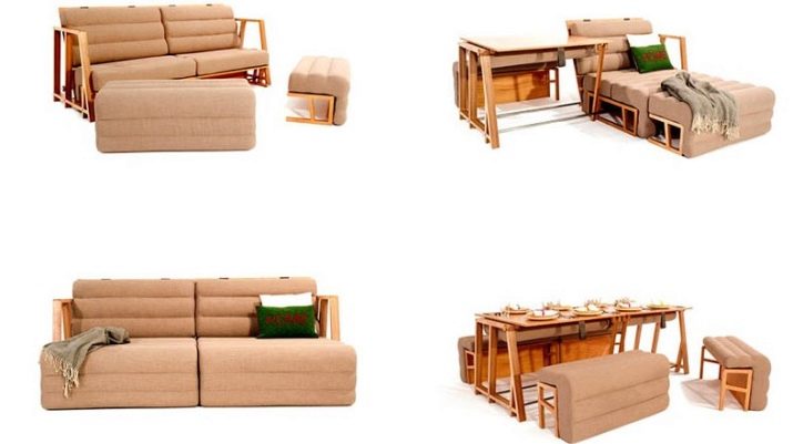 Produkty z tej grupy są różne. Opcje lakoniczne mają miejsce do cumowania i 2 fotele boczne. Po złożeniu nie różnią się niczym od zwykłych sof. W rozłożeniu oprócz łóżka tworzą stół z krzesłami, a nawet pufami.