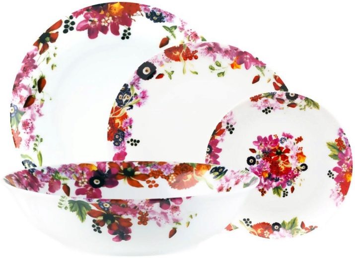 - Bukiet owoców. Zestaw stołowy o niezwykłej urodzie składa się z 19 elementów. Każdy ma obramowanie w postaci jasnych kolorów, na talerzu deserowym znajduje się dodatkowo zdjęcie na środku. Czerwony, różowy, fioletowy, granatowy, zielony i inne odcienie zdobią naczynia, nadając im świąteczny wygląd. Usługa obejmuje: 6 głębokich talerzy do zupy, 6 talerzy do przekąsek i deserów, 6 talerzy do gorących dań, salaterkę o średnicy 23 cm. Koszt to 5200 rubli.