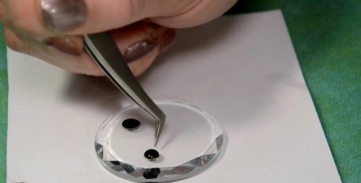 - Teraz musisz zacząć praca z dodatkowymi akcesoriami. Dla większej wygody i komfortu możesz użyć pęsety. Przede wszystkim konieczne jest nałożenie warstwy kleju - można to zrobić za pomocą wacika (wygodne jest również, aby usunąć nadmiar lub ponownie nałożyć dodatkową warstwę).