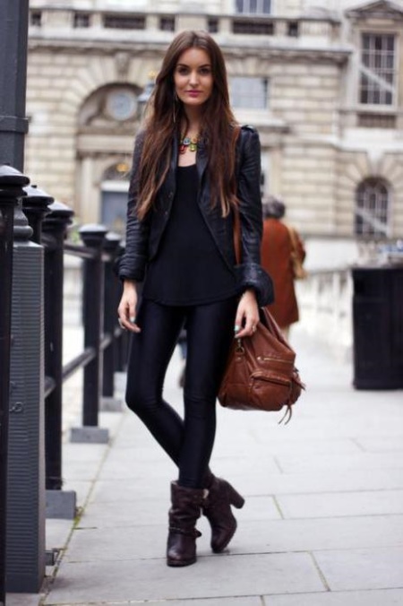 - Botki na wysokich stabilnych obcasach, dzianinowa tunika, pasy z paskiem w kolorze butów, legginsy - stylowy wizerunek na spacer.