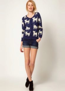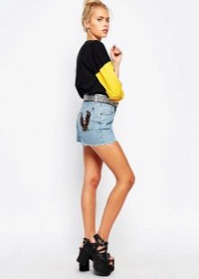 - Spektakularny wygląd odpowiedni na co dzień, a także na specjalne okazje. Spodenki z wysokim stanem, wąski sweter z jasnym nadrukiem i szpilki sandały noszone na błyszczących skarpetach. Obraz uzupełnia dżinsowa torba na długim pasku. Taki strój na pewno nie pozwoli ci pozostać niezauważonym!