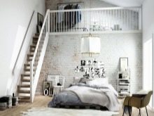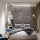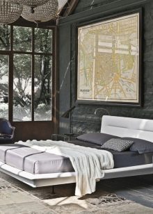 Jeśli zwykła biała powierzchnia nie przyciąga zbyt wiele ludzi, możesz spojrzeć na inną opcję - kombinacje betonu z elementami drewnianymi i lustrzanymi. Indywidualnie wszystkie z nich zwykle wyglądają banalnie, jednak w ścisłym połączeniu tworzą znacznie ciekawszą kompozycję. A także zasługują na uwagę i listwy - po długim zapomnieniu znów wracają do arsenału projektantów. Zwykle listwy otaczają obszar za głową łóżka. Można je jednak stosować na innych powierzchniach.