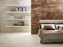 Dość powszechną alternatywą dla cegieł są płytki lub płytki ceramiczne. Jest stale zalecany przez projektantów, którzy opracowują niestandardowe metody dekoracji przestrzeni. Sam pomysł użycia takiego materiału wydaje się niezgodny z głównym celem sypialni.