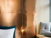 Kolejny oryginalny sposób projektowania - użycie metalu. Mosiężne wykończenie jest atrakcyjnym złotem i ma gładką fakturę. Można go łatwo łączyć z kolorami naturalnymi i pastelowymi. W stylu loftu elementy metalowe i drewniane są zwykle łączone. Czasami wskazane jest stosowanie nie tylko mosiądzu, ale także gatunków stali nierdzewnej.
