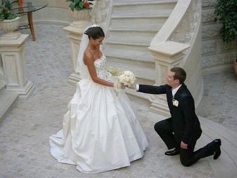 Świetną opcją byłby niezależny wybór bukietu panny młodej. W końcu sama dziewczyna na pewno wie, która opcja najlepiej pasuje do sukni ślubnej i będzie w jej guście. Czasami musisz zobaczyć gałązkę rośliny lub pączka, aby dokonać wyboru. W takim przypadku pan młody może po prostu zapłacić za zakup. Kolejnym plusem będzie to, że młody człowiek nie będzie musiał przełamać ważnej tradycji i zapytać o projekt sukni ślubnej.