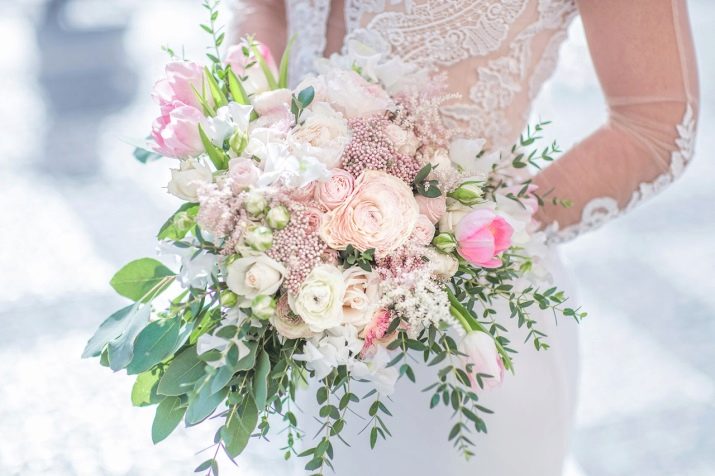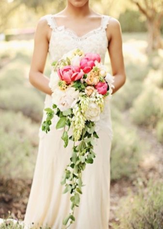 Bukiet w formie kaskady jest odpowiedni dla wysokich dziewcząt w długiej prostej sukni. Jeśli zostaną wybrane rośliny z dużymi pąkami, nie powinno ich być zbyt wiele. W przeciwnym razie bukiet będzie wyglądał zbyt obszernie. Przeciwnie, małe rośliny powinny być większe.