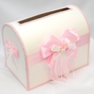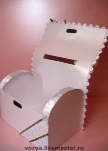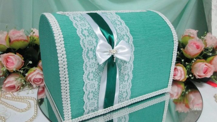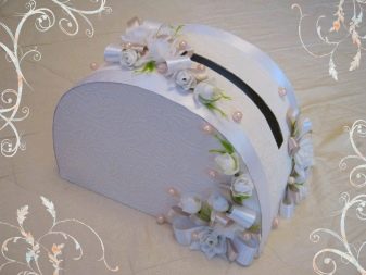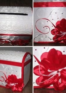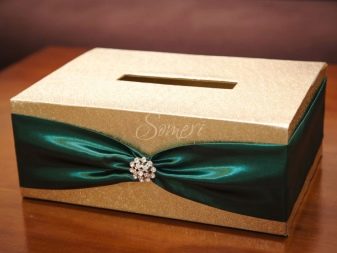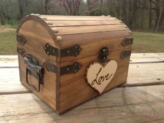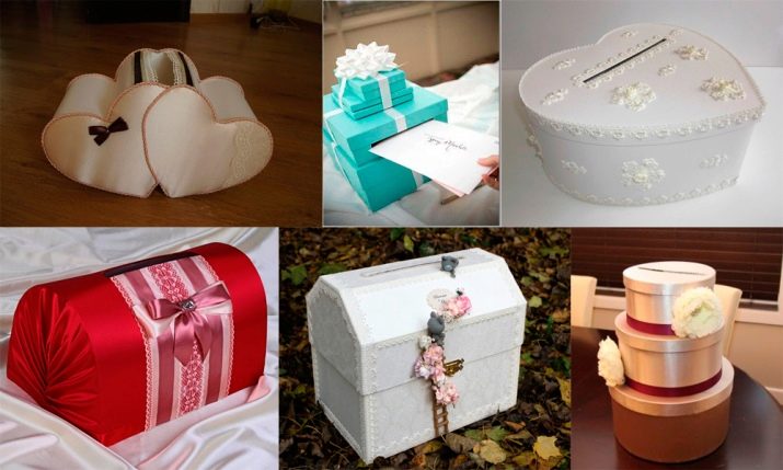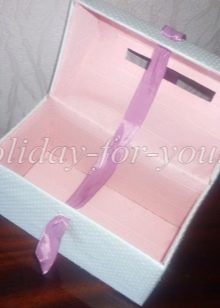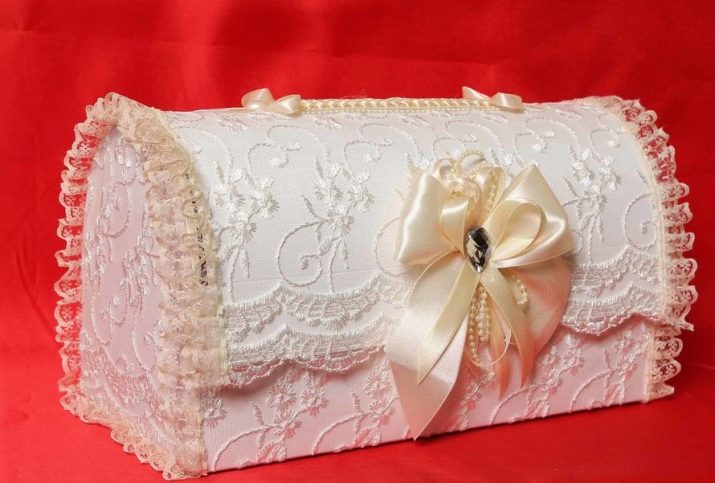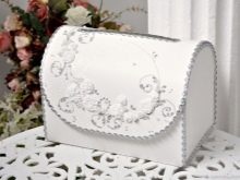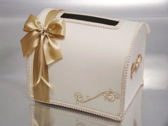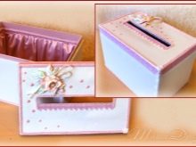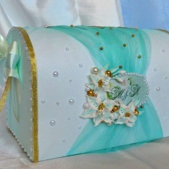 Najpopularniejszą opcją jest okrągłe i kwadratowe pudełko okolicznościowe, kupione lub wykonane ręcznie.Zazwyczaj przygotowanie do wakacji zajmuje dużo czasu, więc wykonanie takiego akcesorium będzie łatwe, zwłaszcza jeśli wiesz, co należy zrobić. W takim przypadku, jeśli chcesz czegoś niezwykłego, możesz ustawić produkt w kształcie serca lub beczki. Jeśli para już czeka na pierworodnych, możesz zrobić skrzynię spacerową, a ci, którzy planują podróż po ceremonii, mogą stworzyć pudełko w postaci samochodu lub statku, które będą wyglądać oryginalnie i interesująco.