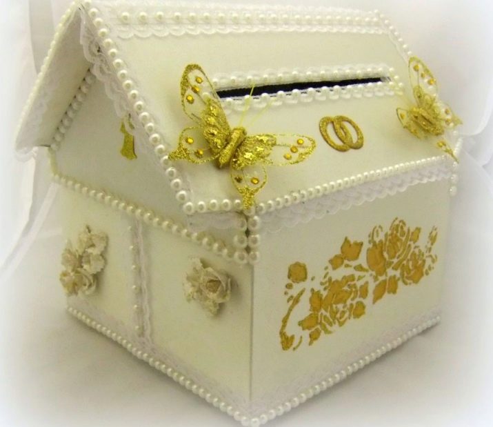 Dla tych, którzy chcą się wyróżniać nie kolorem, ale kształtem, dom, samochód lub statek będą idealnymi opcjami, możesz również zrobić wózek. Takie produkty mają zwykle ukryte znaczenie, pozwalając zrozumieć, na co dokładnie nowożeńcy zbierają pieniądze. Kolorystyka tutaj będzie jasna, a wystrój jest miękki i dyskretny. Małe kwiaty, perłowe koraliki i kwiatowe wzory wykonane w bardziej kontrastowym kolorze mogą uzupełniać produkt.
