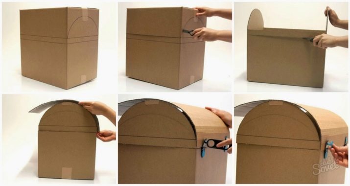 - Następnym krokiem jest praca nad pokrywą, która zwykle ma trójwymiarowy kształt w klatce piersiowej. Aby grubo tekturowo pięknie, a co najważniejsze, równomiernie zgiąć, nadając półkolisty kształt, musisz wykonać kilka podłużnych pasków po wewnętrznej stronie produktu. Warto pamiętać, że nadmierna siła po naciśnięciu spowoduje pojawienie się dziury w produkcie i wszystko trzeba będzie zacząć od nowa. Gdy tylko osiągniesz pożądany kształt, musisz naprawić część objętościową za pomocą podstawy, co pozwala uzyskać pożądaną skrzynię. Lepiej wybrać wewnętrzną część do mocowania, pozwoli to uniknąć widocznych połączeń i miejsc klejenia, co sprawi, że wygląd będzie bardziej atrakcyjny.