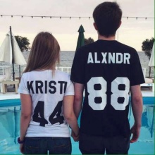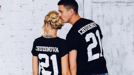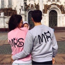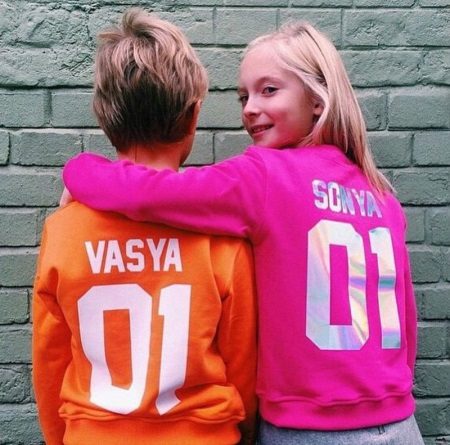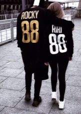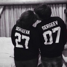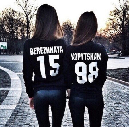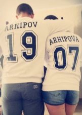 Jeśli chodzi o sparowane bluzy, oto te same opcje, co na pojedynczych, najważniejsze jest to, że napisy są wykonane w tym samym stylu. Tylko imiona, nazwiska z jednym nazwiskiem i cyfrą ze znaczącą datą. To samo dotyczy rodzinnych bluz, kiedy każdy członek rodziny ma swoją małą rzecz zrobioną w tym samym stylu.