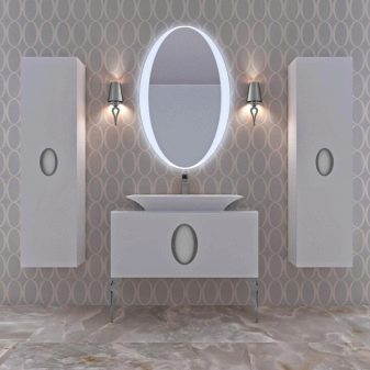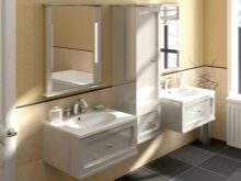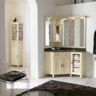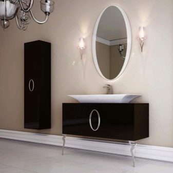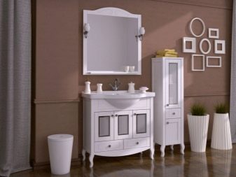 Przy wyborze wyglądu zestawu słuchawkowego należy wziąć pod uwagę wnętrze pokoju i jego wymiary. W małej łazience lepiej wybrać lekki model zwięzłego designu. Białe meble są idealne. Dobrym rozwiązaniem jest również beżowy zestaw. W tym przypadku dobrym wyborem byłaby górna szafka z lustrzanymi drzwiami. Taki przedmiot będzie wydawał się nieważki, jakby rozpuszczał się w przestrzeni, wizualnie rozszerzając pomieszczenie. Jednocześnie zyskujesz pojemne miejsce do przechowywania ważnych drobiazgów.