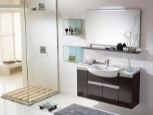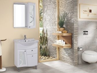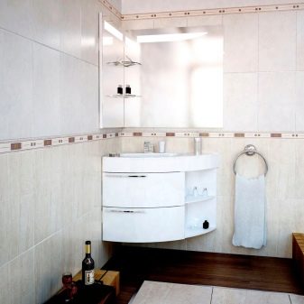 W tym przypadku rolę miejsca do przechowywania odgrywa szafka, w której zamontowana jest umywalka. To rozwiązanie pozwala nie tylko ukryć wąż spustowy wody, ale także umieścić detergenty i inne drobne rzeczy. A także lustro można połączyć z szafką. Tutaj możesz ukryć szczoteczki do zębów, produkty do golenia i wiele więcej przed ciekawskimi oczami. W rezultacie meble zajmują bardzo mało miejsca, ale pozwala zorganizować doskonały system przechowywania.