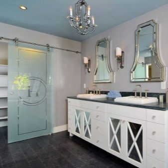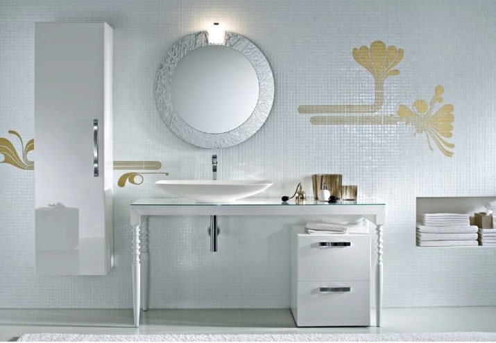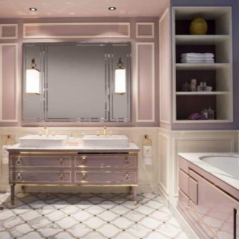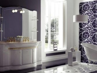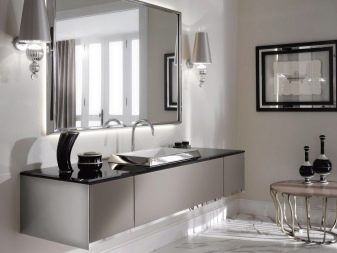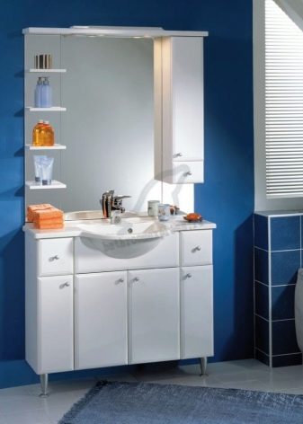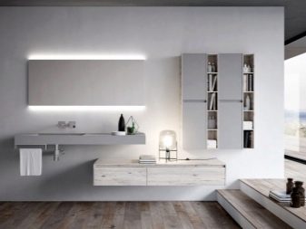 Jeśli łazienka jest przestronna, możesz nie tylko kupić moydodyr z szerokim blatem, ale także umieścić zestaw słuchawkowy na różnych ścianach. Wnętrze będzie harmonijne i całościowe.