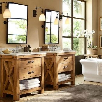 Formy takich mebli mają również orientację vintage. Jednak w tym przypadku nie ma potrzeby luksusu. Mile widziana jest maksymalna prostota. Powierzchnie wykonane są w matowym kolorze (imitacja malowanego drewna). Akcesoria imitują brąz.