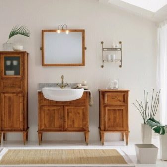 Oczywiście, produkty drewniane są mądrzejsze do kupienia, jeśli łazienka jest duża. Jeśli pomieszczenie jest ciasne, a krople wody ciągle latają na meble, lepiej wybrać coś bardziej praktycznego.