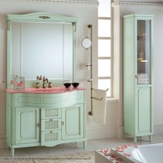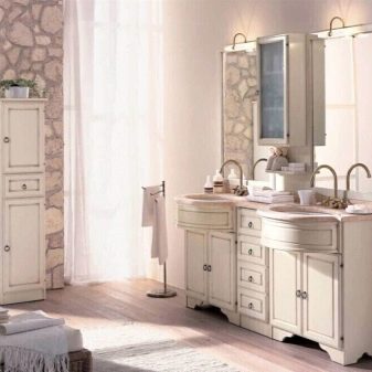 W tym stylu domy wiejskie są zwykle dekorowane, chociaż czasami stosuje się je również w mieszkaniach. Dominują tutaj delikatne odcienie: niebieski, beżowy, pistacjowy, lawendowy, jasnoszary. Oczywiście popularne są również śnieżnobiałe zestawy słuchawkowe. Takie zestawy, podobnie jak te klasyczne, często mają proste lustro w ramie i wolnostojącą szafkę.