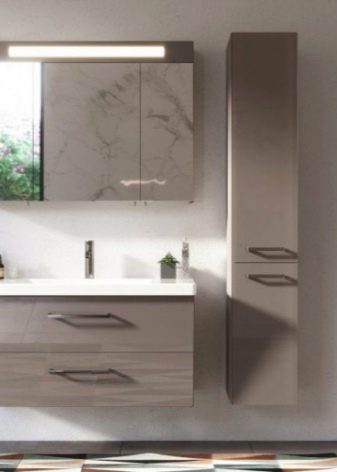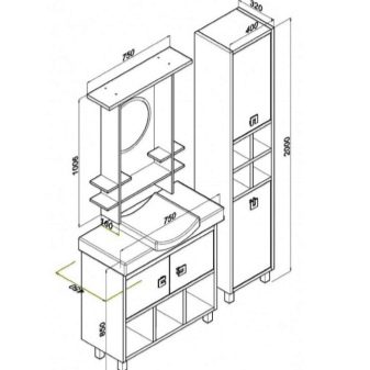 Górna szafka, w połączeniu z lustrem, zwykle odpowiada szerokości szafki znajdującej się pod nią. Dzięki temu zestawy wyglądają harmonijnie. Czasami zestawy mebli łazienkowych obejmują piórniki. Wąskie szafki znajdują się z boku umywalki, więc ich wysokość ogranicza jedynie sufit i zdrowy rozsądek. Głębokość jest podobna do innych elementów zestawu (od 40 do 45 cm.)