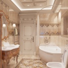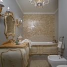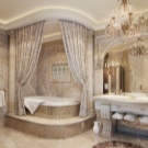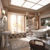 Gałąź klasycznego stylu, tylko bardziej luksusowa i królewska majestatyczna. W takim przypadku pomieszczenie powinno być tak duże, jak to możliwe, i musi być w nim okno. Tylko w tym przypadku okaże się, że ucieleśnia ten styl. Marmur na podłodze jest tu mile widziany, malowidła ścienne na ścianach, ciężkie zasłony powinny być umieszczone na oknach. Miskę do kąpieli można również zainstalować na środku pokoju. Będzie świetnie, jeśli będzie umieszczony na cokole.