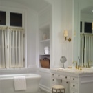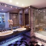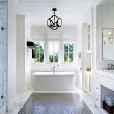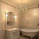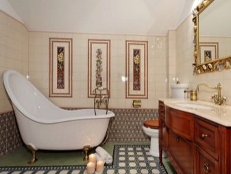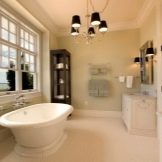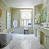 Klasyczna łazienka to uosobienie luksusu i przepychu. Zapraszamy zabytkowe krany i krany, powierzchnie wykonane z marmuru lub innego kamienia. Elementy kucia, złocenia, ażurowe wzory na meblach - bez tego wszystkiego klasyczny styl będzie gorszy. Witamy w łaźniach na lwich łapach, lustrach otoczonych ażurowym tkaniem złoconych wzorów, luksusowych tkanin i kolumn. Żyrandole wiszące w dużych odcieniach lub żarówki imitujące świece dobrze wyglądają. Należy zauważyć, że w małych pokojach ten obszar nie będzie odpowiedni.