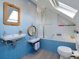 Wielu nawet nie zdaje sobie sprawy, że ich łazienka po remoncie stała się przykładem morskiego stylu, ponieważ domyślnie całe pokolenia Rosjan dekorują ten pokój w niebieskich odcieniach. Ale w przeciwieństwie do przeszłości, gdy nudna kwadratowa płytka znajdowała się na ścianach i suficie, teraz możesz urozmaicić wnętrze ciekawymi wstawkami, umieszczając imitację hełmu, i wybierz ręczniki z nadrukiem przypominającym kamizelkę z biało-niebieskimi paskami.