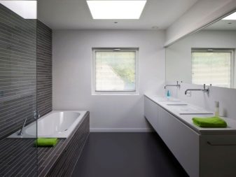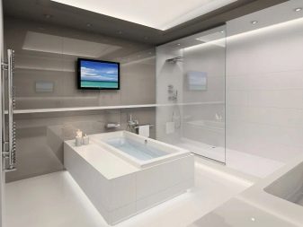 Oprawy muszą być wbudowane z rozproszonym światłem. W łazience może być znany owal, ale nadal lepiej jest zwrócić uwagę na jacuzzi lub miskę z hydromasażem. Taka hydraulika najdokładniej odzwierciedli nowoczesność pokoju. Nowoczesne urządzenia hydrauliczne mogą być tylko chromowane, w przeciwnym razie ten pokój może być tylko częściowo uznany za przykład tego stylu. Jeśli obok łazienki jest kabina prysznicowa, to należy to zrobić tak samo w odpowiednich kolorach - jest to szary, biały, chrom.