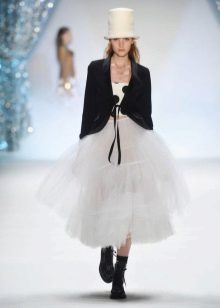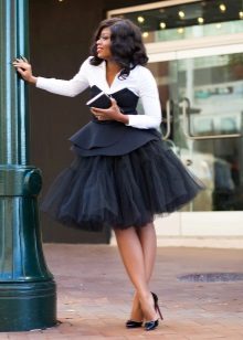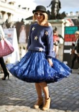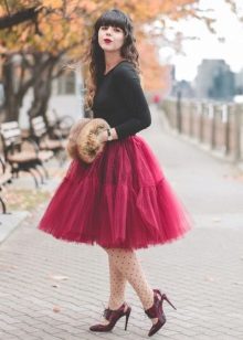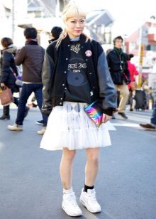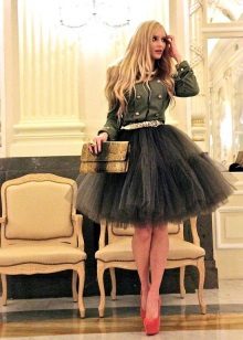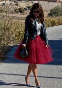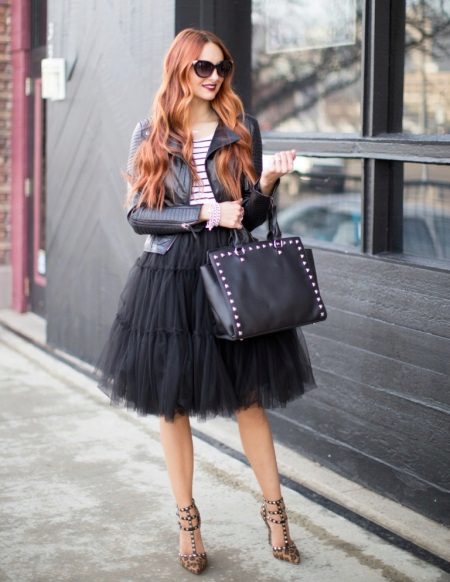 Przy chłodnej pogodzie możesz założyć skórzaną kurtkę i niegrzeczne buty na taką spódnicę. Ładne połączenie „amerykańskiego” i topu z dzianin lub dżinsów, a także zestawu z spódnicy tego stylu z dzianinowym swetrem.
