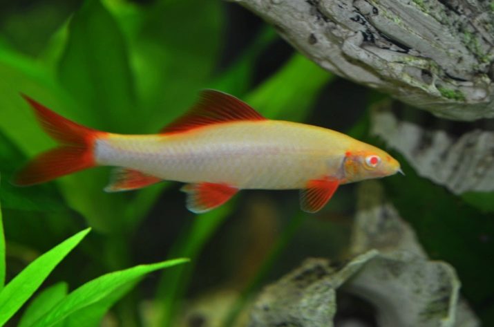 - Labeo frenatus albino (barbatana vermelha). O corpo deste peixe é mais fino e mais longo que outros tipos de labeos. Os olhos são vermelhos, como as barbatanas (às vezes apenas a cauda é vermelha e o restante é branco). O corpo é branco com um tom rosado. Ele mora na Tailândia.