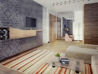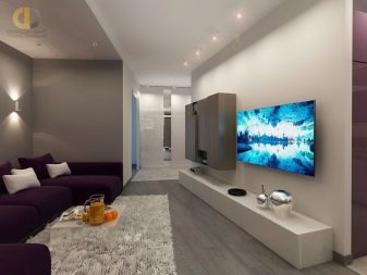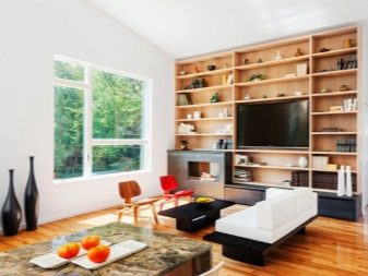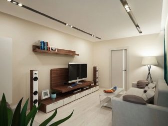 - Outra opção moderna e interessante para uma estreita sala retangular. Suporte de TV espaçoso, estantes confortáveis, uma mesa de café lacônica, para a qual, se necessário, você pode almoçar. A colocação diagonal do laminado expande visualmente a sala, como, no entanto, um papel de parede leve. Uma prateleira de bancada em vez de uma mesa de trabalho é uma solução robusta para um espaço pequeno.
