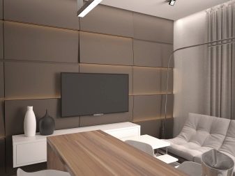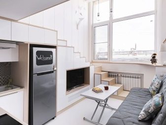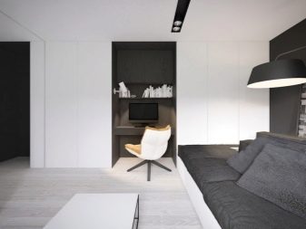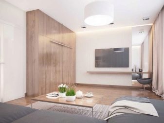 E por 15 quadrados, o minimalismo é realmente uma boa solução. Muitas vezes, modelos de transformadores com alta funcionalidade aparecem nessas salas. Por exemplo, um sofá que não é muito grande quando dobrado é disposto e se torna espaçoso. Ou uma mesa de café se transforma em uma grande mesa de jantar.