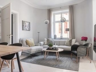 - Interior escandinavo legal, revigorante e democrático. A decoração mais simples da parede, uma solução clássica com piso, um suporte de TV espaçoso (e prático), um sofá confortável, uma mesa "arejada" - todos os objetos são simples, mas juntos são uma solução muito elegante.