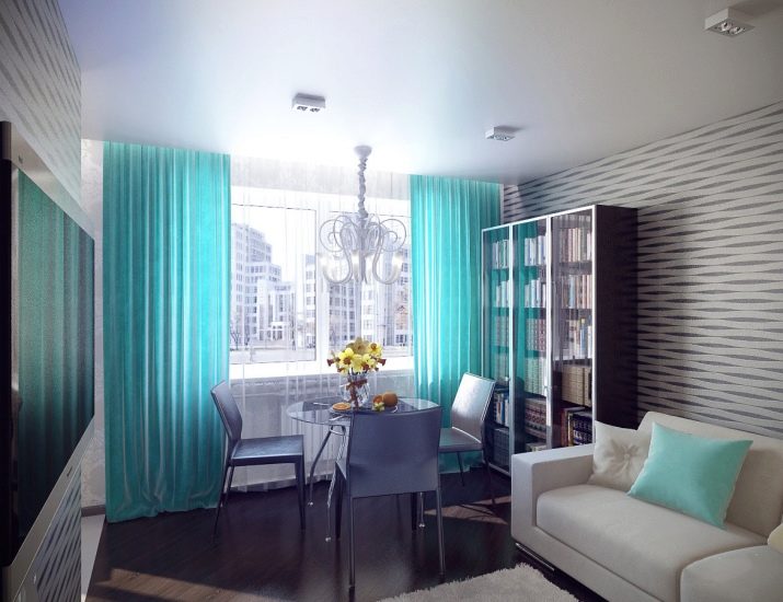 - A cor turquesa neste interior não é a principal, mas tornou-se acentuada. A área da biblioteca, a mesa com cadeiras, o sofá e a área de mídia também se encaixam em uma pequena filmagem. Para não sobrecarregar o espaço, os proprietários escolheram uma mesa de vidro "arejada". Novamente, há um layout diagonal do revestimento do piso.