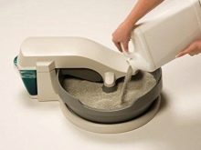 O próximo modelo é chamado Caixa CatGenie com descarga automática para gatos. Este é um dispositivo mais complexo, que é elétrico e também se conecta ao abastecimento de água. Uma instância bastante interessante, pois quase todos os processos nela são automatizados. Esta bandeja possui grânulos especiais feitos de plástico, que substituem a carga usual de gato. Como sistema de limpeza de banheiros, a água é misturada com um desinfetante. Os grânulos contaminados nesta bandeja são removidos automaticamente. Entre outras coisas, a bandeja deste fabricante usa um sistema de secagem de superfície. Isso permite que a bandeja fique constantemente seca para que o animal fique confortável.