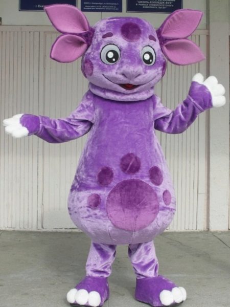 Muitas crianças estão interessadas em dinossauros e gostam de assistir desenhos animados e filmes sobre essas criaturas pré-históricas. Portanto, este traje também está em demanda. Este modelo cria uma impressão muito realista: tem a cor inerente dos dinossauros, um pente na cabeça, garras nas patas traseiras e uma cauda longa com espinhos impressionantes. Mas o traje não é assustador, porque abre o rosto sorridente do animador. As crianças vão gostar de dançar ou jogar um jogo ao ar livre com este animal divertido.