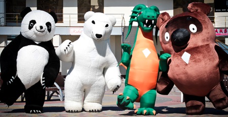 Assim, ao usar esse traje, os animadores obtêm um efeito visual de primeira classe a um custo mínimo. Observe que os trajes infláveis são muito procurados nas festas infantis. Muitas crianças acreditam sinceramente que esses personagens estão vivos - eles parecem tão realistas.