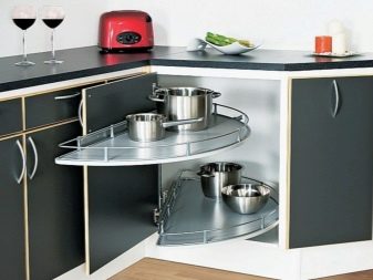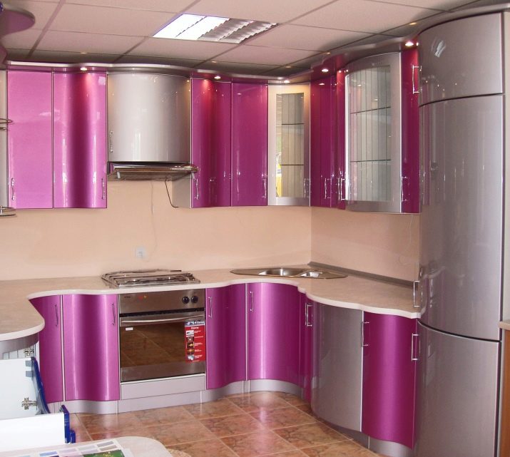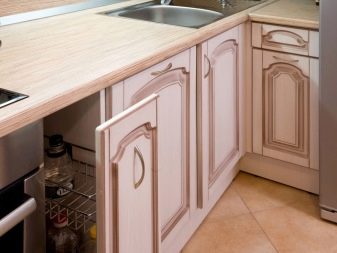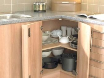 Uma exceção é o módulo chanfrado angular. É claro que é mais profundo e mais amplo, devido às suas características de design. Mas seus lados, nos quais são montados armários comuns, têm o mesmo tamanho padrão. O mesmo se aplica aos módulos com fachadas curvas e onduladas - sua profundidade não pode ser alterada, mas um gabinete adjacente com uma máquina de lavar louça ou forno embutidos será padrão.