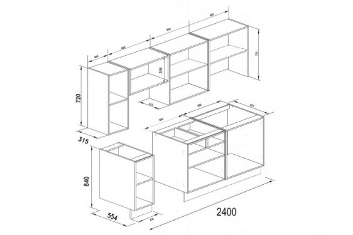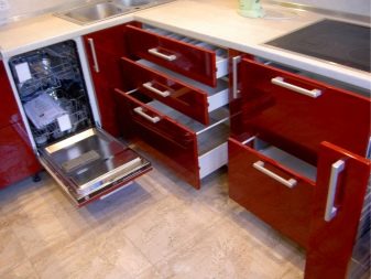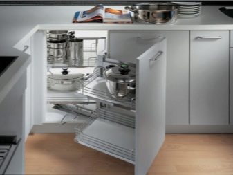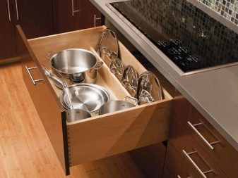 Também é necessário planejar antecipadamente o preenchimento interno. Cada conjunto de móveis de cozinha deve ter pelo menos uma gaveta, por exemplo, para colheres e garfos. A gaveta simplesmente não cabe em um armário com profundidade inferior a 45 cm.Portas articuladas podem ser instaladas em armários de qualquer profundidade, mas ainda é mais conveniente usar gavetas. Para utensílios de cozinha grandes, como um caldeirão grande ou uma caixa com um processador de alimentos, são necessários os compartimentos apropriados. Se isso não for previsto a tempo, todos os utensílios de cozinha simplesmente não servirão.