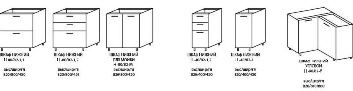 O armário de cozinha de piso consiste em uma fachada (portas), um fundo, laterais, uma parede traseira e prateleiras internas. Uma mesa é colocada em cima. O armário é colocado sobre as pernas, que podem ser fechadas com uma base. No interior, uma prateleira é montada de maneira padrão (exceto as seções para lavagem), mas seu número pode ser aumentado, se desejado. Além disso, eles podem colocar mecanismos retráteis, sistemas de armazenamento ou dispositivos internos.