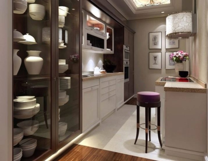 De fato, neste caso, você terá que pegar uma pequena pia e uma placa com dois queimadores. Sim, e a superfície de trabalho terá que se sacrificar. Usar uma bancada estreita é inconveniente - é difícil cortar produtos ou colocar tudo o que você precisa.