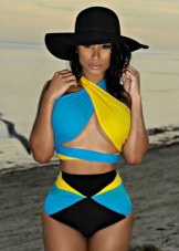 Para meninas gordas, os designers apresentam modelos de fusão feitos em duas cores contrastantes - escurecer os lados reduz visualmente a cintura, tornando a figura mais esbelta.