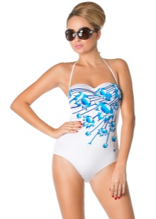 Estampa floral, embora desbotada no fundo, mas ainda assim está disponível em alguns modelos de moda praia. Com flores grandes no corpete, é recomendável comprar roupas de banho para as meninas que não podem se gabar de um busto exuberante, mas que podem demonstrar com orgulho sua cintura fina sem um pingo de libras extras.