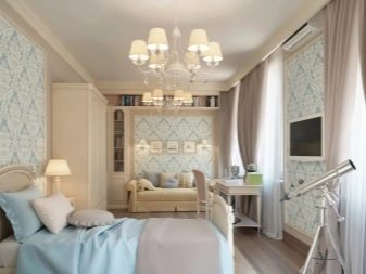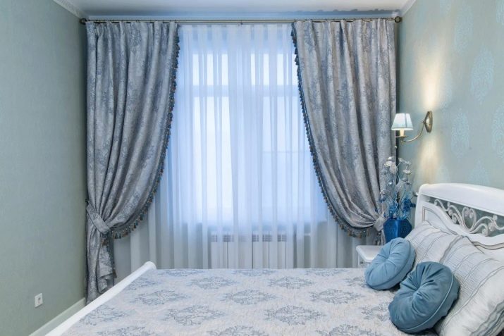 Se o lado norte e o sol raramente espreitar no quarto, pode valer a pena limitar-se a algumas cortinas de cores pastel. Rosa pálido, lilás claro, bege moderado, amarelo pálido - todos eles estão em perfeita harmonia com o papel de parede azul nas paredes e adicionam calor e conforto ao quarto. Uma boa união de azul com marrom - Cria uma atmosfera de conforto em casa, configurada para relaxar.