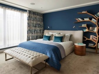 Um quarto em uma única paleta azul parece muito gentil e pacífico. No entanto, para que a sala não se funda em um espaço informe, a sombra das cortinas deve contrastar um pouco com as paredes - diferem em um ou mais tons.