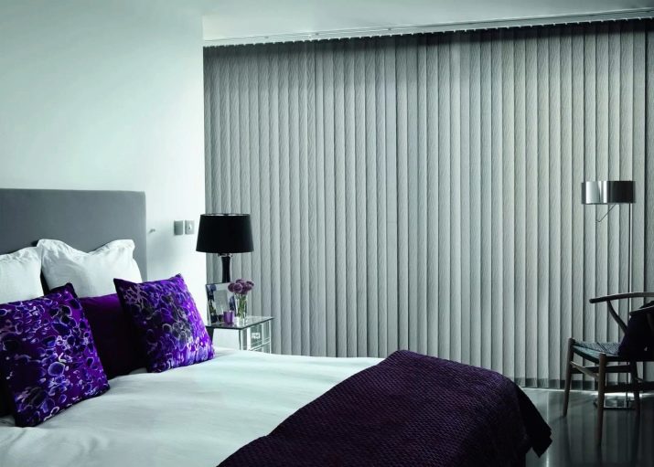 Como alternativa às cortinas de tecido tradicionais para um quarto azul com um interior minimalista, você pode escolher cortinas de cor de aço. Esta é uma opção particularmente boa para aqueles cujo quarto também é um escritório. Essas cortinas enfatizam a gravidade da situação e não desviam os detalhes desnecessários.