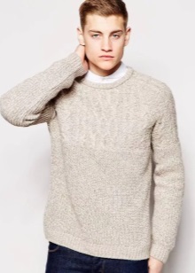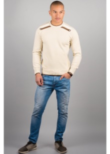 Modelele masculine de pulovere bej arată foarte elegante și armonioase în tandem cu blugi clasici obișnuiți și aproape orice pantof, ceea ce dovedește versatilitatea unor astfel de haine.