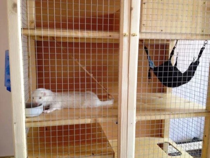 O cușcă spațioasă este casa ideală pentru dihorul alb. Deci, în dimensiunile sale, ar trebui să fie nu mai puțin de 60 cm lățime, 80 cm lungime și 45 cm înălțime. Distanța dintre tije nu trebuie să fie mai mare de 5 cm. Este mai bine să acordați preferință celulelor realizate din materiale durabile (de exemplu, metal). În caz contrar, animalul de companie își poate distruge casa. Opțiunea ideală este alegerea unei celule cu mai multe etaje și cu o mare varietate de tuneluri.