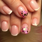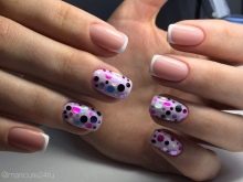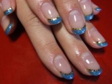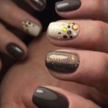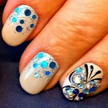- Pe un fundal bej, colectăm puncte într-o manieră haotică, cercuri albastre, albastru închis și auriu. Facem una sau două unghii.Pe restul desenăm faimosii urși de pelerină, pe degetul mare puteți înfățișa o inscripție, acoperiți unghia cu culoarea unuia dintre elementele de paiete.