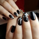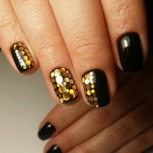 - Pe un fundal negru, aproape întreaga paletă captivantă și suculentă va arăta original, de la nuanțe metalice pâlpâitoare până la intonații lucioase, mate de roșu violet, albastru regal, visiniu. Pe un fundal negru, puteți pune logo-ul unei mărci celebre precum Dior, Versace, D&G folosind paiete.