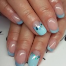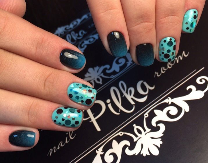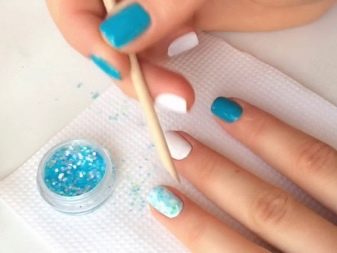 - Spațiu negativ pe un fundal de turcoaz, nuanțe de azur poate fi umplut cu un decor care este aproape în gama. Jumătate din unghie este acoperită cu lac de gel, cealaltă cu elemente multicolore de diferite forme.